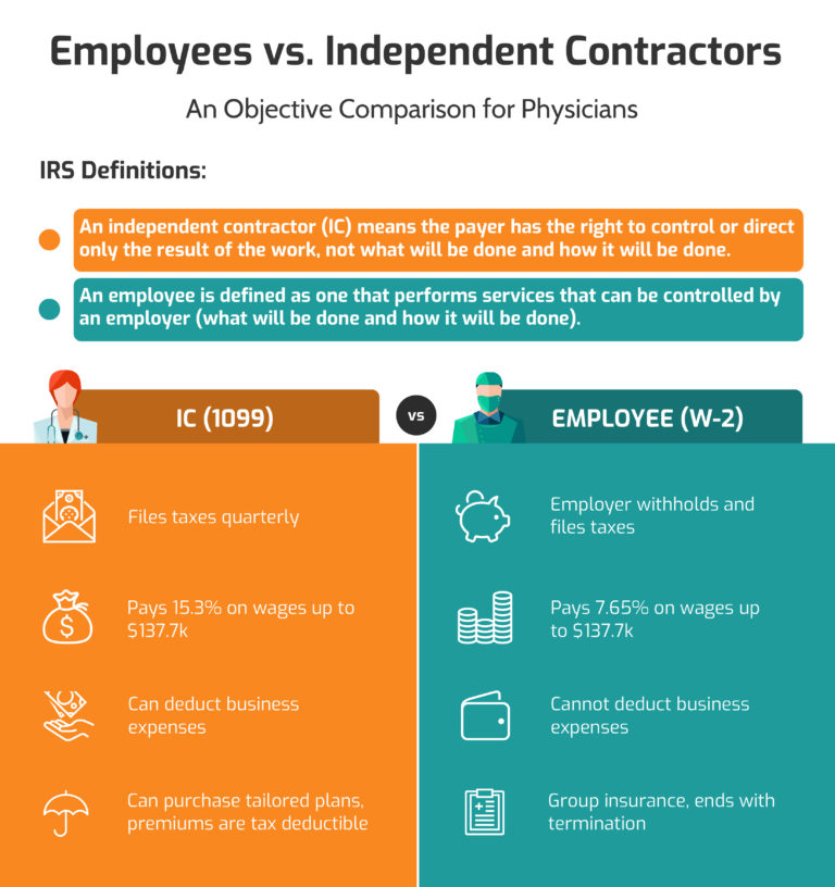 Employee vs. independent contractor – what is the right fit for you? Hospitals and health systems nationwide partner with physician services groups to operate and provide coverage for emergency departments versus employing physicians on their own. This commonality often leads physicians to the question of which employment model is better – employed (W-2) or independent contractor (1099)?