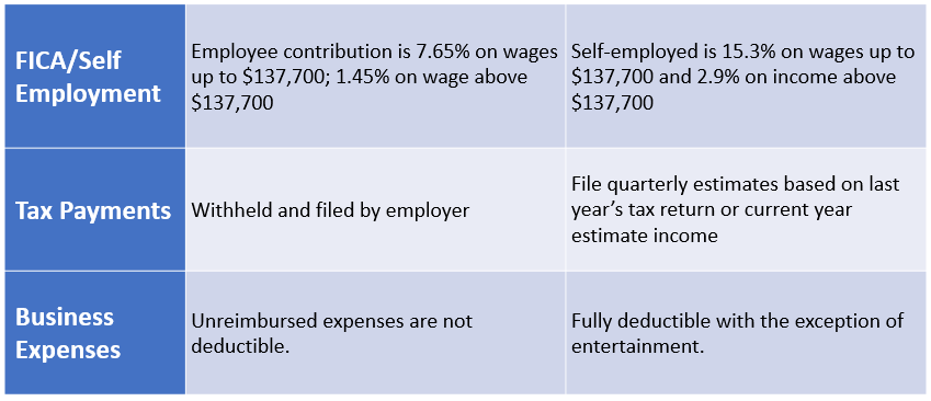 Federal Insurance Contributions Act (FICA) is how self-employment taxes are collected. As an employee, all tax payments are withheld and filed by the employer. As an IC, the individual files quarterly estimates based on last year’s tax return or current year’s estimated income.