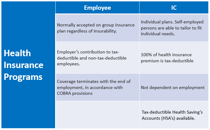An employer’s benefits package may not include everything you need adding additional expenses to your wallet. Be sure to thoroughly research what is offered. You may be surprised there is not much of a difference in purchasing customized plans as an IC. Packages to consider include: