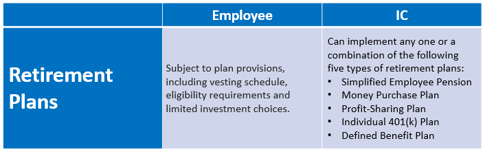 The information provided is not written or intended as tax or legal advice and may not be relied on for purposes of avoiding federal tax penalties. Described in this text are some of the many advantages of being paid as an independent contractor (IC). The scenarios provided regarding tax saving and retirement planning strategies are neither recommendations nor suggestions but are merely examples. Individuals are encouraged to seek advice from their own financial advisor, CPA and/or legal counsel.