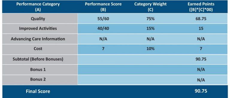 A physician group performs well for each quality measure and scores 55 points. The group fulfills the Improvement Activities category resulting in 40 points. As the group is a hospital-based group, the Advancing Care Information portion is rolled into the Quality category. Through CMS’ calculations, the group receives 7 points in the cost category. The individual physician’s MIPS score is: