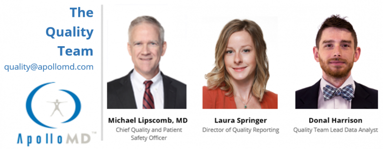 At ApolloMD, our Quality team does their best to provide monthly updates and educational resources to our provider teams. We understand that education is the best practice for ensuring exceptional performance and strive to provide this to all of our team members. For any questions or comments, please email quality@apollomd.com.