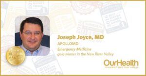 Joseph Joyce, MD – Dr. Joseph Joyce was recognized as the gold winner in the Emergency Medicine category for Best Bedside Manner by OurHealth Roanoke & New River Valleys Magazine. Congratulations, Dr. Joyce!