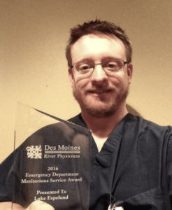 Dr. Luke Espelund – Dr. Luke Espelund was awarded the Meritorious Service Award for 2016 at Mercy Medical Center. This exceptional award recognizes a Mercy Medical Center Emergency Department provider who demonstrates an exceptional job performance and who embodies the attributes of empathy, teamwork, initiative, and excellence! Congratulations, Dr. Espelund!