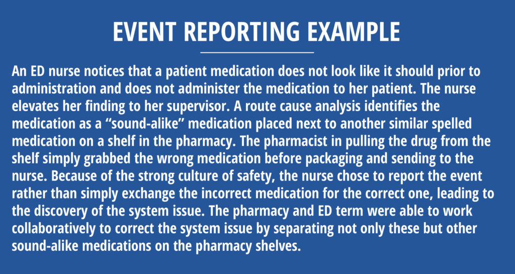 Establishing an environment that promotes event reporting is a critical component of patient safety. An individual is less likely to report a mistake if he or she fears it will result in a negative consequence.