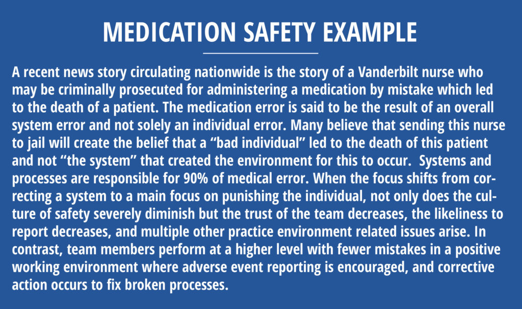 Leadership support is often the driving force encouraging team members to report adverse events and near misses. In the event of a mistake, leadership should take a positive focus on correcting the process, rather than a punitive decision for an individual. A “no blame” environment allows clinicians and other team members to be more comfortable in the practice setting which improves efficiency and increases the likeliness of mistake reporting.