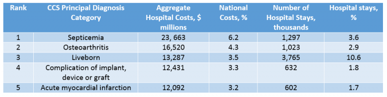 - Septicemia is the most expensive medical condition treated in U.S. hospitals nationwide by a significant margin. Ranking well behind are osteoarthritis, liveborn, complication of implant/device/graft and acute MI, according to the Agency for Healthcare Research and Quality.