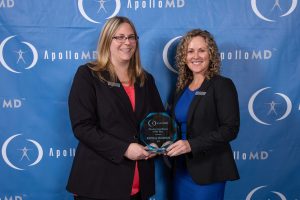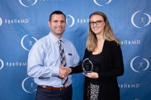 “Krystal began her career as a part-time employee with ApolloMD at a small hospital system in Iowa,” explained Casey Crane, ApolloMD Executive Vice President, Front Billing Operations. “Once she heard of an opening at MercyOne in Des Moines, she immediately approached me to express interest. This particular facility was a much larger system than Krystal was accustomed to working but enthusiastically accepted the challenge. Krystal exceeded all expectations and has become integral to the operations team, physician leaders and providers. She was unanimously nominated by her medical directors, Dr. Gary Hemann and Dr. Hijineo Carreon and all members of the regional management team. Congratulations Krystal!”
