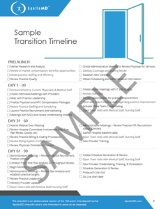 ApolloMD delivers a 105-point, interdepartmental checklist customized to each facility, its employees, market and needs for near- and long-term improvement and patient satisfaction scores, she notes. Click here to download a free sample of the ApolloMD transition checklist.