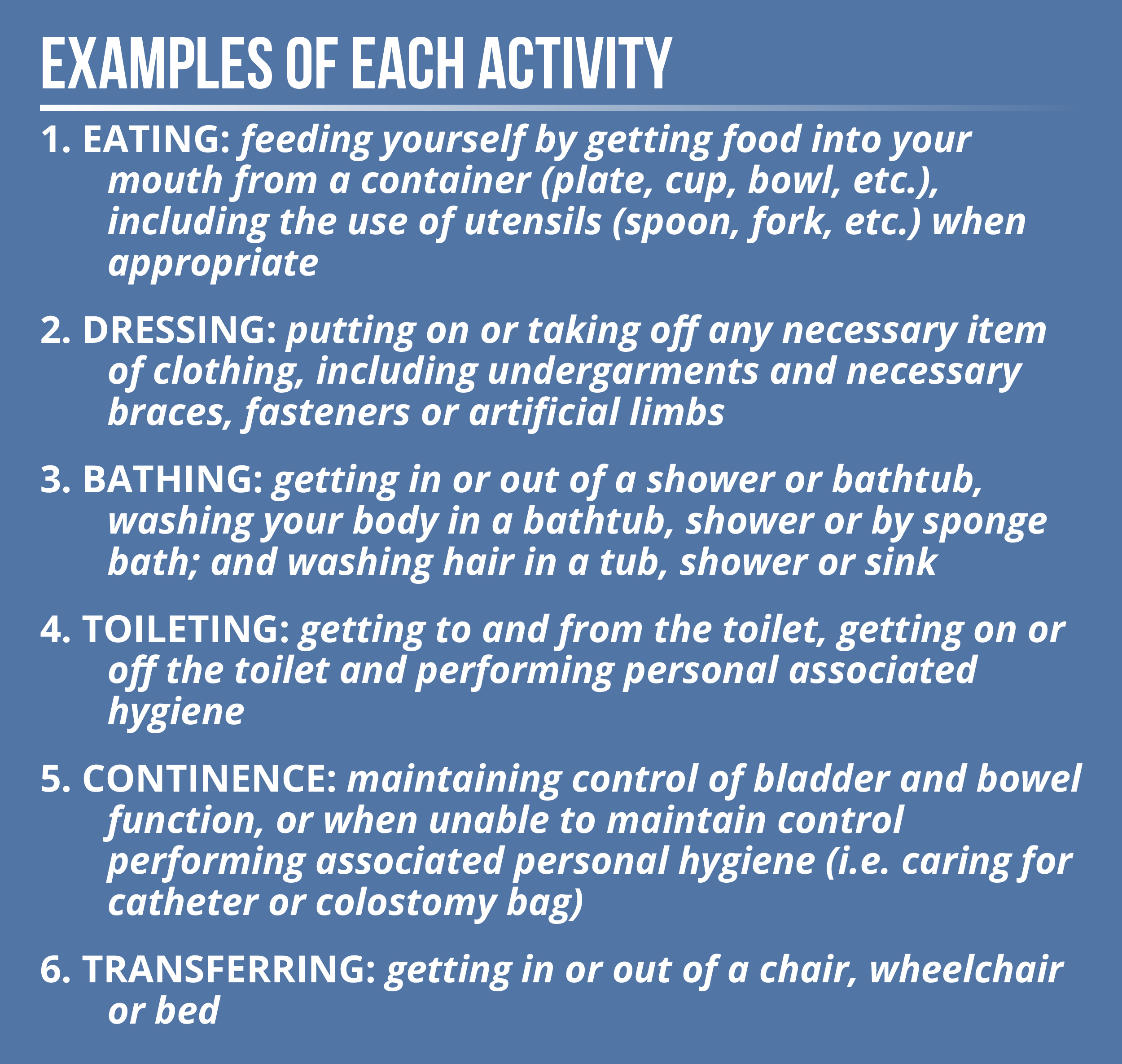 A catastrophic rider provides benefits in the event an individual becomes disabled and needs assistance with two of the six activities of daily living.
