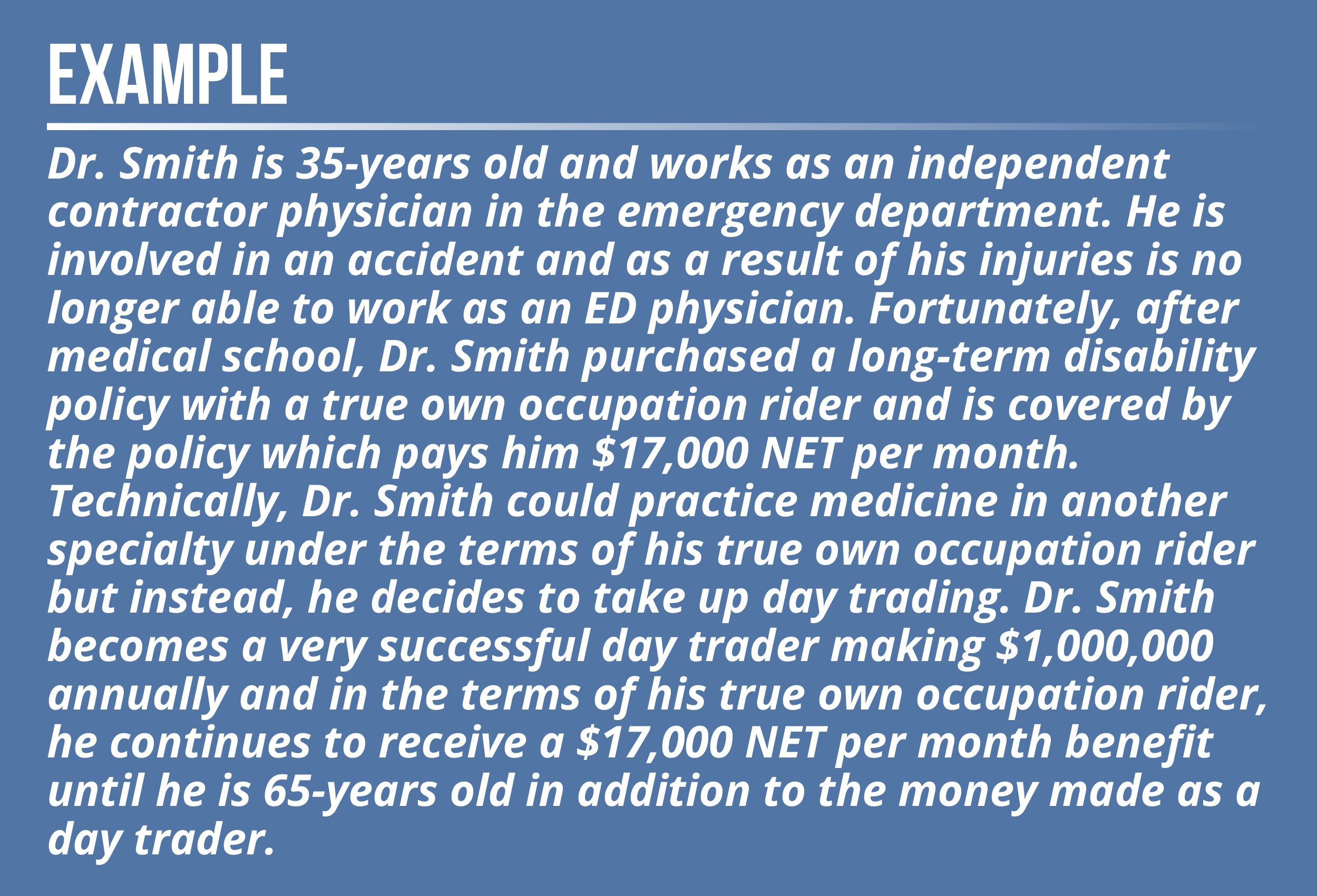 True own occupation scenarios differ from carrier to carrier. Some carriers will state a disabled person is eligible as long as the total income does not surpass the amount of income previously made. In the example with Dr. Smith, he would not receive the $17,000 per month benefit if he was averaging $1,000,000 per year as a day trader. However, he could receive the $17,000 per month working a job with a salary less than his physician salary.