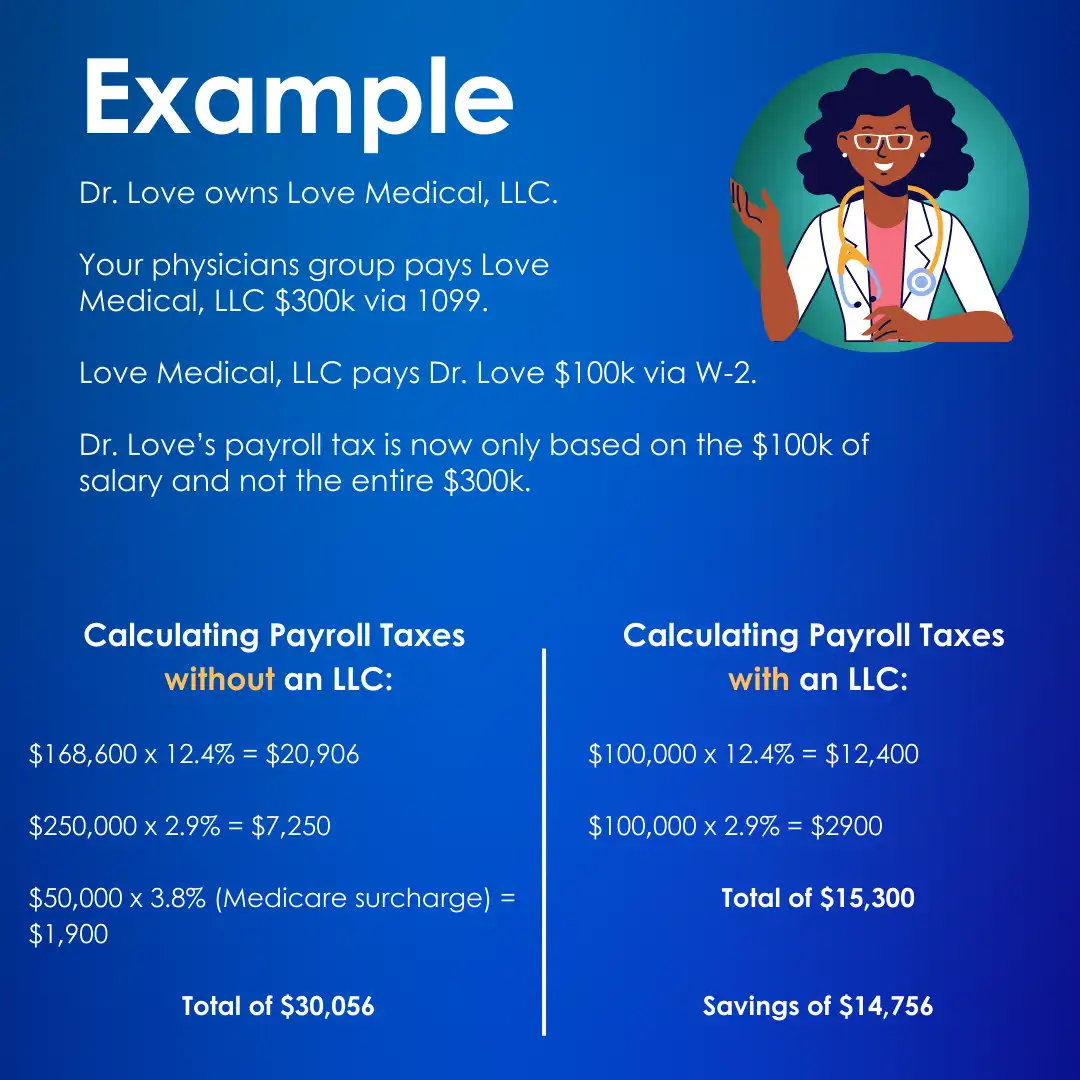 The first reason a physician should form an LLC is that you can save huge on payroll taxes.