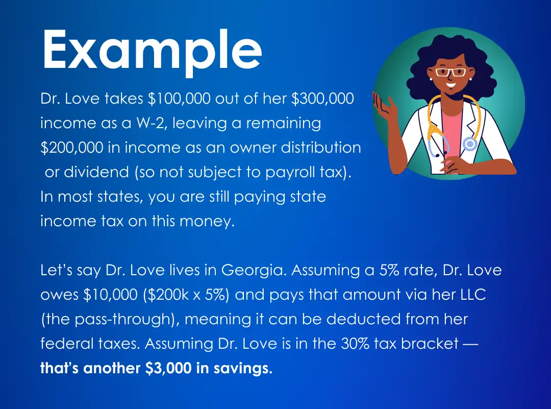 The second reason doctors should form an LLC is to take advantage of the Pass-Through Entity Level Tax or PTE.