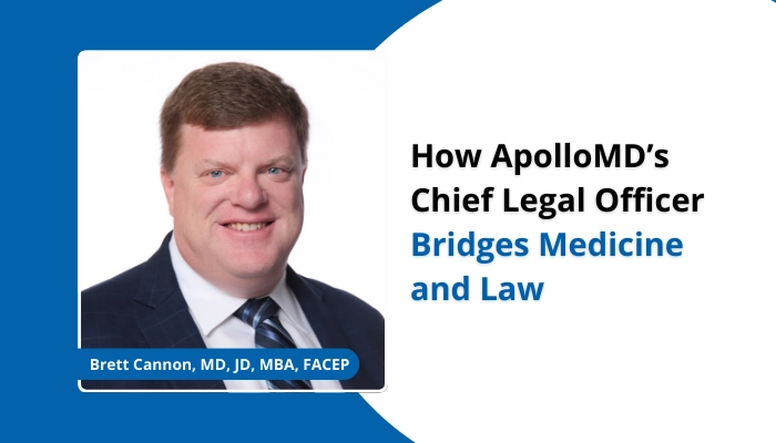 After 25 years as an emergency physician and healthcare executive, Brett Cannon, MD, JD, MBA, FACEP added “Chief Legal Officer” to his title at ApolloMD. His dual expertise in medicine and law strengthens advocacy for physicians, patients, and the healthcare system on issues from managed care to the No Surprises Act.